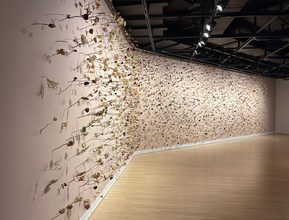 Piquées sur un mur peint en référence à la couleur de l'épiderme, ces fleurs mortuaires deviennent à la fois dessin dans l’espace, théâtre d’ombres et horizon tronqué, esquisse d'un cycle de vie qui prend fin, qui mu et deviendra poussière. Cette installation florale est mise en relation avec des photographies où les détails et les indices s'accumulent pour former une longue phrase visuelle ouvrant la porte à des histoires à s'approprier.